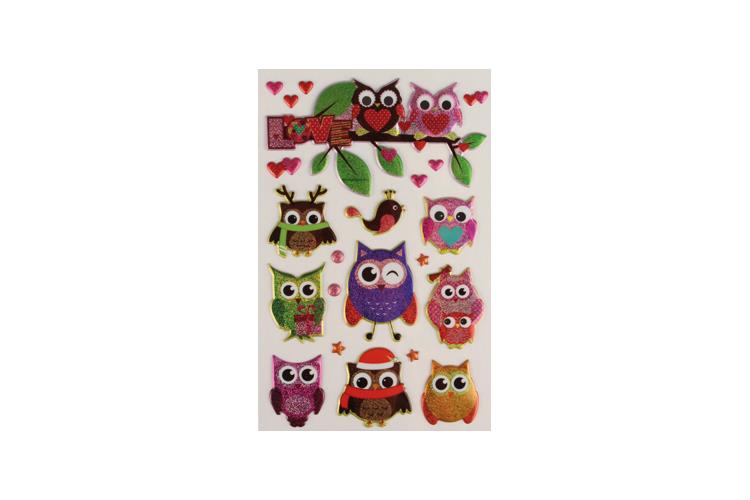 21 stickers 3D métallisés couleurs assorties - hiboux de 0.5 à 9 cm